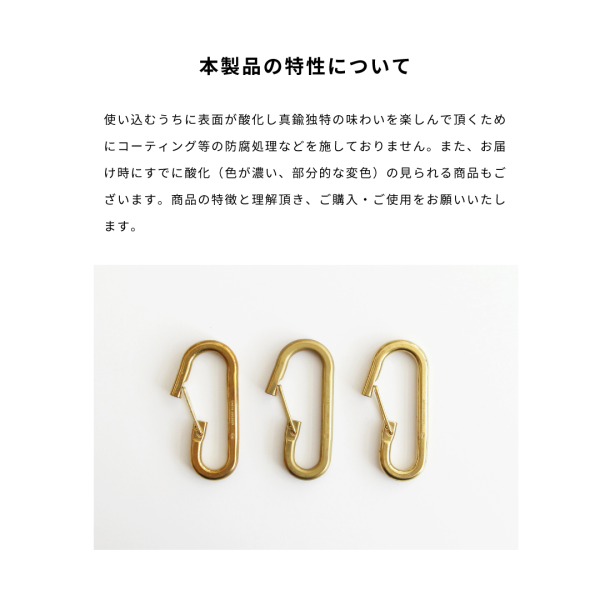 カラビナの形をしたキーリング 開口が広く取られており キーリングとして扱いやすい仕様。 あえて真鍮独特の味わいを 楽しんで頂くために コーティング等の防腐処理などを 施しておらず、経年変化を楽しめます。 【注意事項】 説明の通り 一部、使い込むうちに表面が酸化し 真鍮独特の味わいを楽しんで頂くために コーティング等の防腐処理などを 施していません。 また、お届け時にすでに酸化 (色が濃い、部分的な変色) の見られる商品もございます。 商品の特徴と理解頂き、 ご購入・ご使用をお願いいたします。 【素材】 ニッケル(銀色) ブラス(金色) 【サイズ】 W7.1×D3.4×H0.5cm