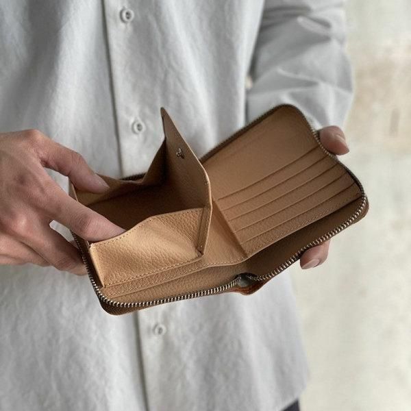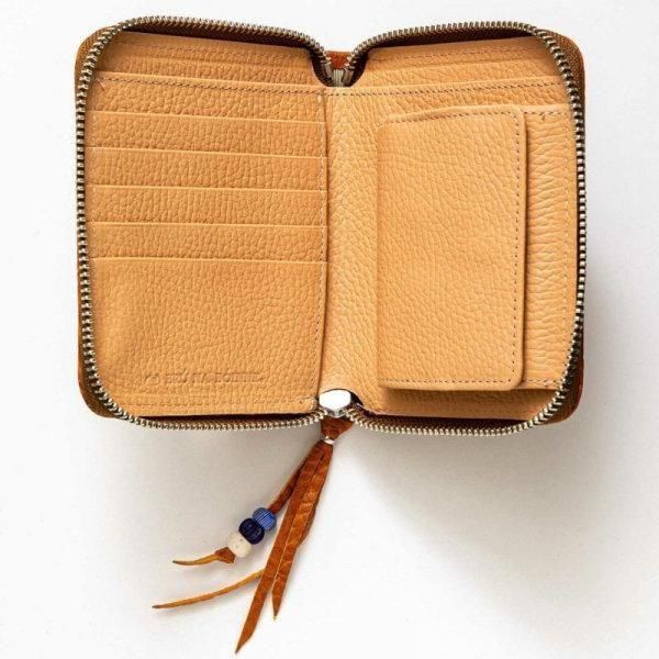 BRU NA BOINNEの 牛のシボ革の財布。 BRU NA BOINNEのシボ革は 一般的なシボ革よりも ワイルドでイレギュラーな表情をもちます。 その秘密は製法にあります。 通常、シボ革は鞣した革をのばして そこにエンボス加工ーーー「シボの型を押す」ことで シボをつけていきます。 そこをBRU NA BOINNEでは 鞣した後の革を一切伸ばさず 一週間、風だけで乾かすことによって 全てナチュラルにシボを作ります。 革は2倍伸ばせば2倍、 3倍伸ばせば3倍安く作れるところを 敢えて一切伸ばさない 質に対するBRU NA BOINNEのこだわり。 なおかつ、 時間も手間も大きな敷地も必要ですが 濃度の違う植物タンニンを張ったピット槽が何個かあり そこに順番に静かに革を漬けて鞣していくことにより、 よく鞣され革が動くと「キュッキュ」と音がする 「鳴き革」と呼ばれる状態になります。 この鳴き革はエンボス加工で作ることはできません。 【いまだかって人のゆかぬ道を心猛く進む】 という、 まさにBRU NA BOINNEの理念が詰め込まれた シュリンクレザーのお財布。 収納力と携帯性のバランスに優れたミドルサイズ 持ち手のフサに装飾されたビーズは 100年以上前の多種多様なアンティークビーズです 【サイズ】 縦11cm 横12.5cm 厚さ2cm 【素材】 表:牛革 内:牛革 【このブランドについて】 BRU NA BOINNE(ブルーナボイン) 〜 ON A UNDEVELOPED WAY , MOVE FORWARD WITH A DESIRE TO FIGHT BE DRESSED IN "THE ONE"〜 「いまだかって人のゆかぬ道を心猛く進む、この服を身にまとい」のテーマをもとに、 糸や生地、ボタンなど素材一つ一つにこだわりながらも、遊び心にあふれ、身につけて楽しく、幸せになる洋服を提案。