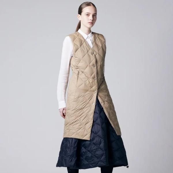 斜めキルトを採用することで、 シックでクラシカルなイメージの キルティングロングジレ。 脇ファスナーを開閉することで、 かなり深いスリットが入り 幅広いレイヤースタイルが楽しめます。 800FLPの上質なダウンを使用しており 保温力も抜群で、秋に1枚で着るのはもちろん 冬にインナーとしてコート等の下に入れるのも おすすめの着方です ※FPL=フィルパワー ダウンが元に戻ろうと膨らむチカラ フィルパワーが高いほうが 大きく膨らみたくさんの空気を含むので、 外気との空気の層ができるので 外の温度が伝わりづらく保温力が強い 800FPLは街はもちろん 登山をはじめとした アウトドアでも使える保温力 【サイズ】 M:着丈96cm / 肩幅38cm / 身幅47.5cm 【素材】 表地:ナイロン100% 裏地:ナイロン100% ダウン95% フェザー5%