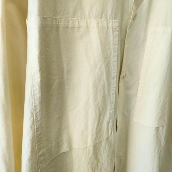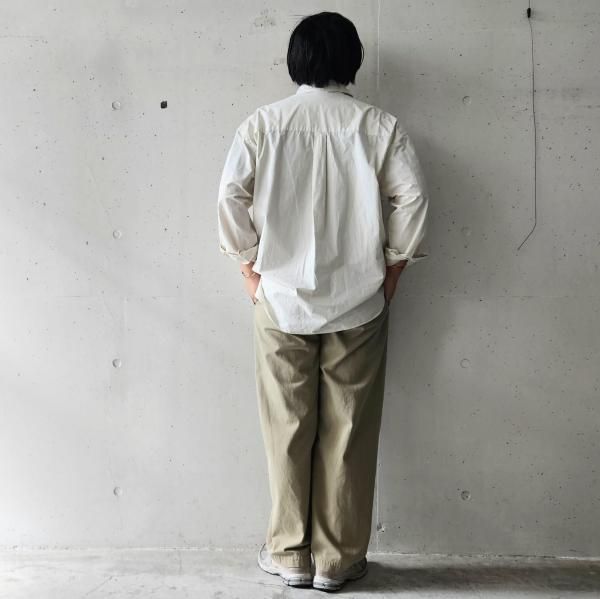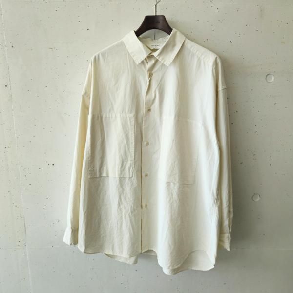 程よくシワ感のある生地感に加えて、余裕を感じられるオーバーサイズなシルエットが少しカジュアルな印象を+してくれるため、大人が着る普段使いのシャツとして使いやすいシャツになっております。