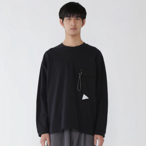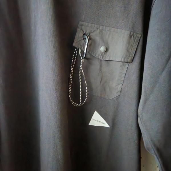 and wander独自の胸のカラビナデザインが魅力のロンT 胸ポケットのにアクセントになるカラビナがついているカットソー カラビナは本来山で滑落を防ぐための道具ですが、その山の道具をあえて服のパーツの一部とすることで、山登りを一つのテーマにしている『and wanderらしさ』を表現するとともに、ビジュアル的なアクセントとして機能しています。 カラビナとポケットを結ぶ紐には反射して光るステッチが仕込まれていて、黒一色の服にマッチしたスタイリッシュなアクセントになっております 生地はスウェットとロンTの中間ぐらいの厚みでロングシーズンご愛用いただけます。 表面はザラザラとしていてとても肌触りがよくついつい着たくなるようなアイテムです。 【素材】 本体:コットン 100% 別布:コットン 70% ポリエステル 30% and wander(アンドワンダー) デザイナー/ 池内啓太、森美穂子 2011春夏からブランドスタート。 アウトドアフィールドで役立つアイテムを展開。 アウトドアでの経験やアイデアを活かし、 テストを繰り返しながらアイテム作りをしています。 週末は山へデザイナー達が新しいアイテムを試しにいっています。