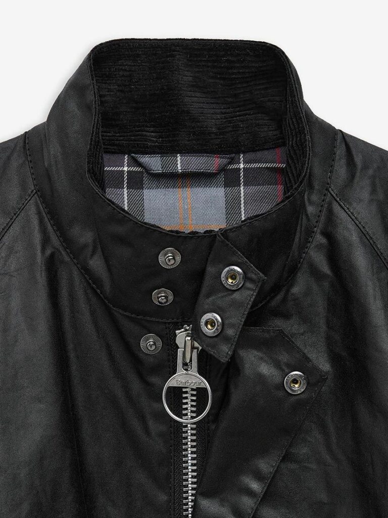 立ち襟になり、一般的なBarbourのモデルよりもスッキリとしたモデルになっております
